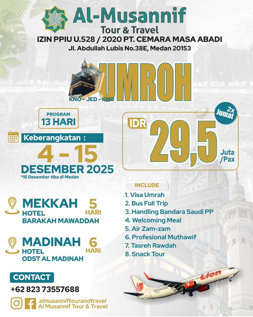 Bersihkan hati, kuatkan iman, dan sempurnakan ibadah dengan perjalanan suci bersama Al-Musannif Tour & Travel 🤲 📅 Keberangkatan: 4 – 15 Desember 2025💰 Hanya 29,5 Juta / Pax (2x Jum’at)📍 Mekkah & Madinah – Hotel nyaman dekat Masjidil Haram & Nabawi 💼 Sudah Termasuk:✅ Visa Umrah✅ Transportasi Full Trip✅ Handling Bandara PP✅ Air Zam-zam✅ Muthawif […]